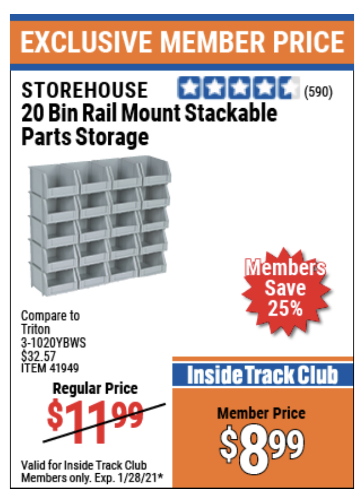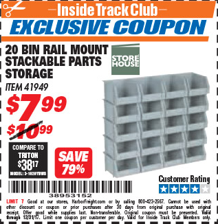 STOREHOUSE Clear Stacking Bin for $2.99 Search our Harbor Freight coupons for deals on Harbor Freight's generators, air compressors, power tools, and more. This is an Inside Track Club deal – valid ...