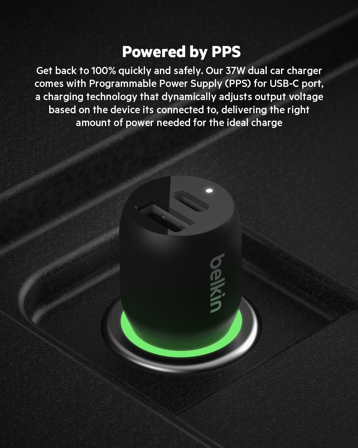 Belkin 37W Dual Port Fast Car Charger, USB Type C 25W PPS Port and USB A 12W Port for Galaxy S22, S21, Plus, Ultra, 5G, Plus, Note 20, iPhone 13, 12, ...