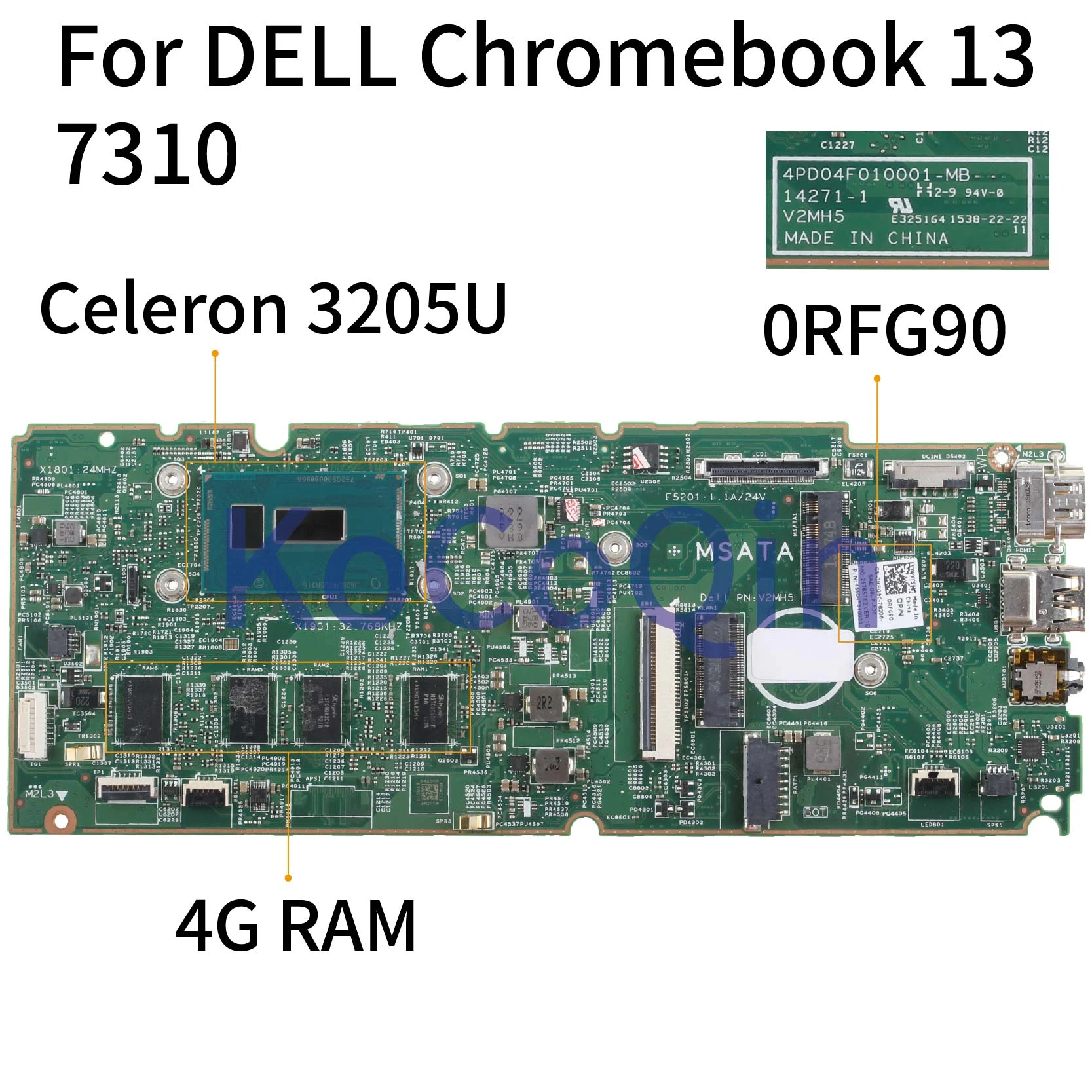 KoCoQin Laptop motherboard For DELL Chromebook 13 7310 Core 3205U 4G RAM Mainboard CN-0RFG90 0RFG90 4PD04F010001-MB 14271-1